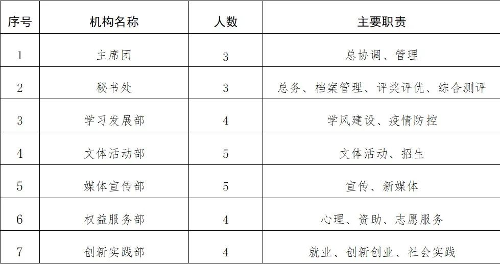 学生会下设秘书处、学习发展部、文体活动部、媒体宣传部、创新实践部、权益服务部六个职能部门,根据工作需要经主席团提议、常代会审议通过可对各职能部门进行适当调整。