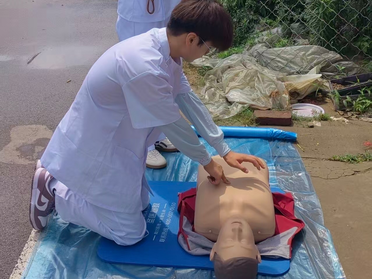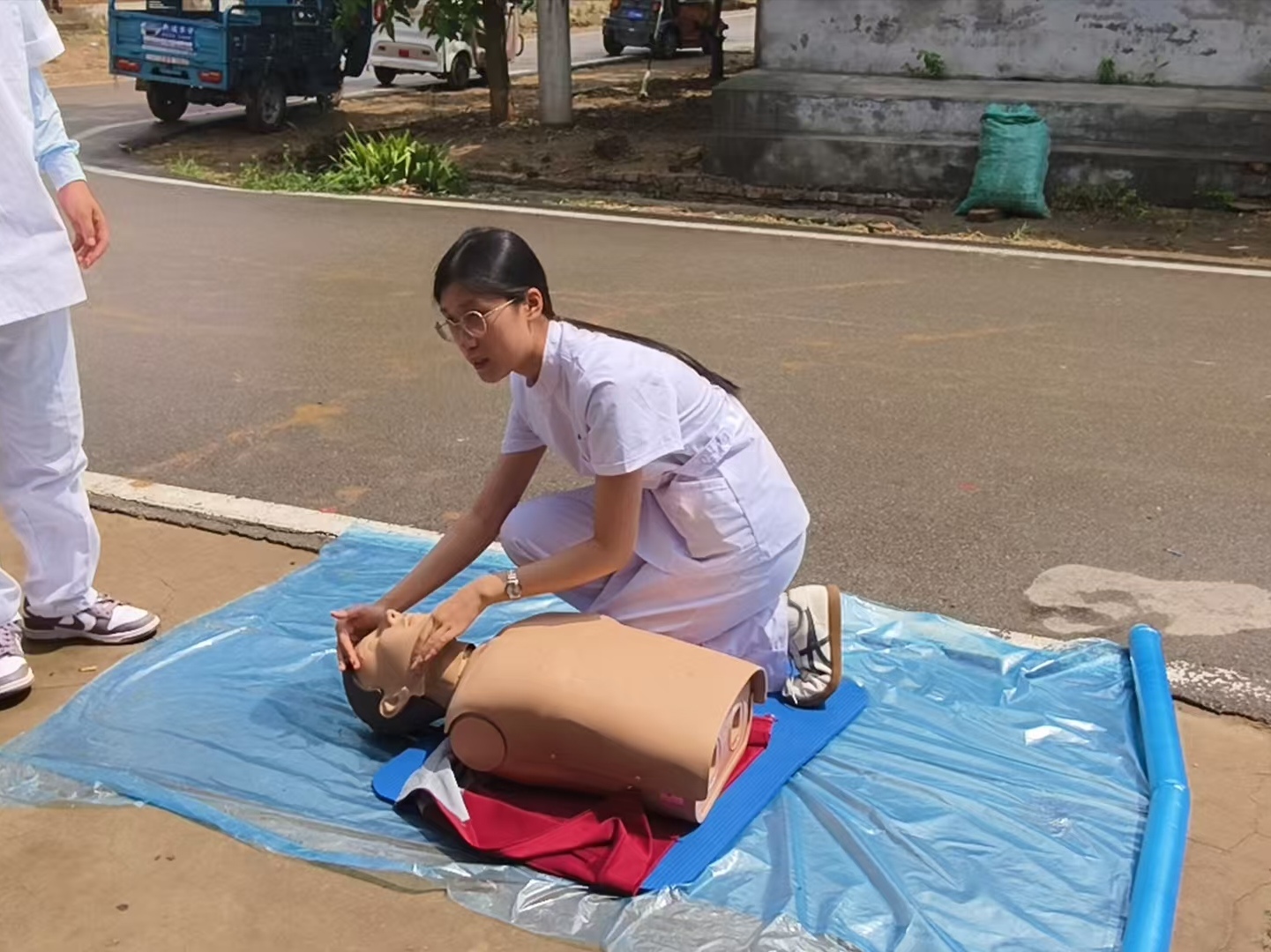 到了村里,老人们坐得整整齐齐,目光都落在我和模拟人身上。主讲人讲解时,我跟着一步步演示,每个动作都尽量标准清晰。看到老人们或点头或跟着比划,我能感觉到他们在认真吸收这些信息。