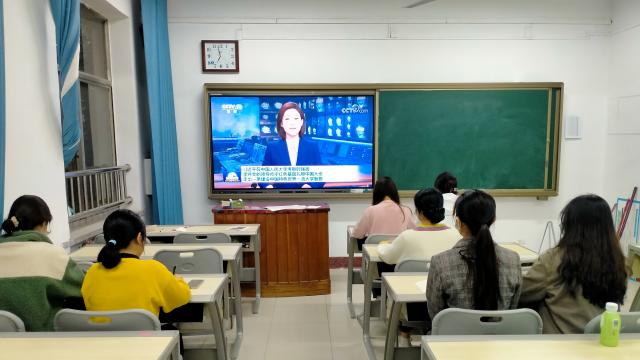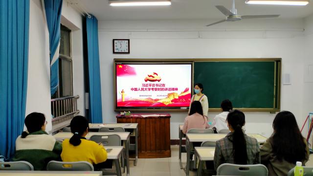 学生党支部全体学生党员在学院307教室共同学习习近平总书记在中国人民大学考察时的讲话精神。