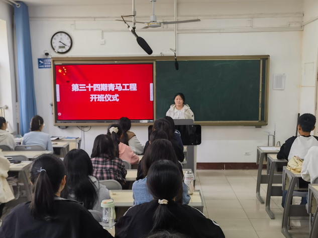 于东校区1号办公楼307举行第三十四期“青马工程”大学生基础培训班开班仪式,李晓雅主持仪式,各班青马工程学员参加。