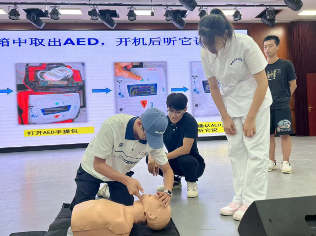 宣讲结束后,校医院医生与服务队成员热情邀请同学们共同参与实践操作,通过模拟实际情境,同学们有机会亲自实践心肺复苏和海姆立克操作等急救技能,这不仅增强了他们的操作能力,也加深了对急救流程的记忆和理解。