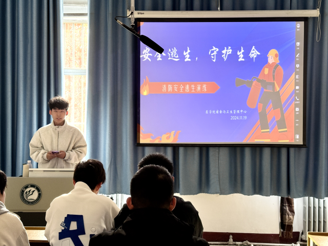 生命无彩排,防患于未“燃”。逃生演练前,主讲人向同学们讲解报警自救、逃生姿势等相关消防知识,并带领同学们辨识楼道平面图和疏散标志等信息,使同学们对于发生火灾时的注意事项和逃生路线有了清晰了解。随后,同学们观看了消防宣传短片,短片通过动画形式,呈现真实的火灾案例,让同学们认识到学习逃生技能的重要性。理论学习结束后,进行逃生疏散演练环节。随着模拟警报声的响起,同学们按照逃生路线捂口鼻、低姿前行,快速有序地进行应急避险和疏散。整个演练过程组织有序,全体人员迅速撤离到安全地带。通过逃生演练,同学们具备了基本的自救和互救能力,收获颇丰。