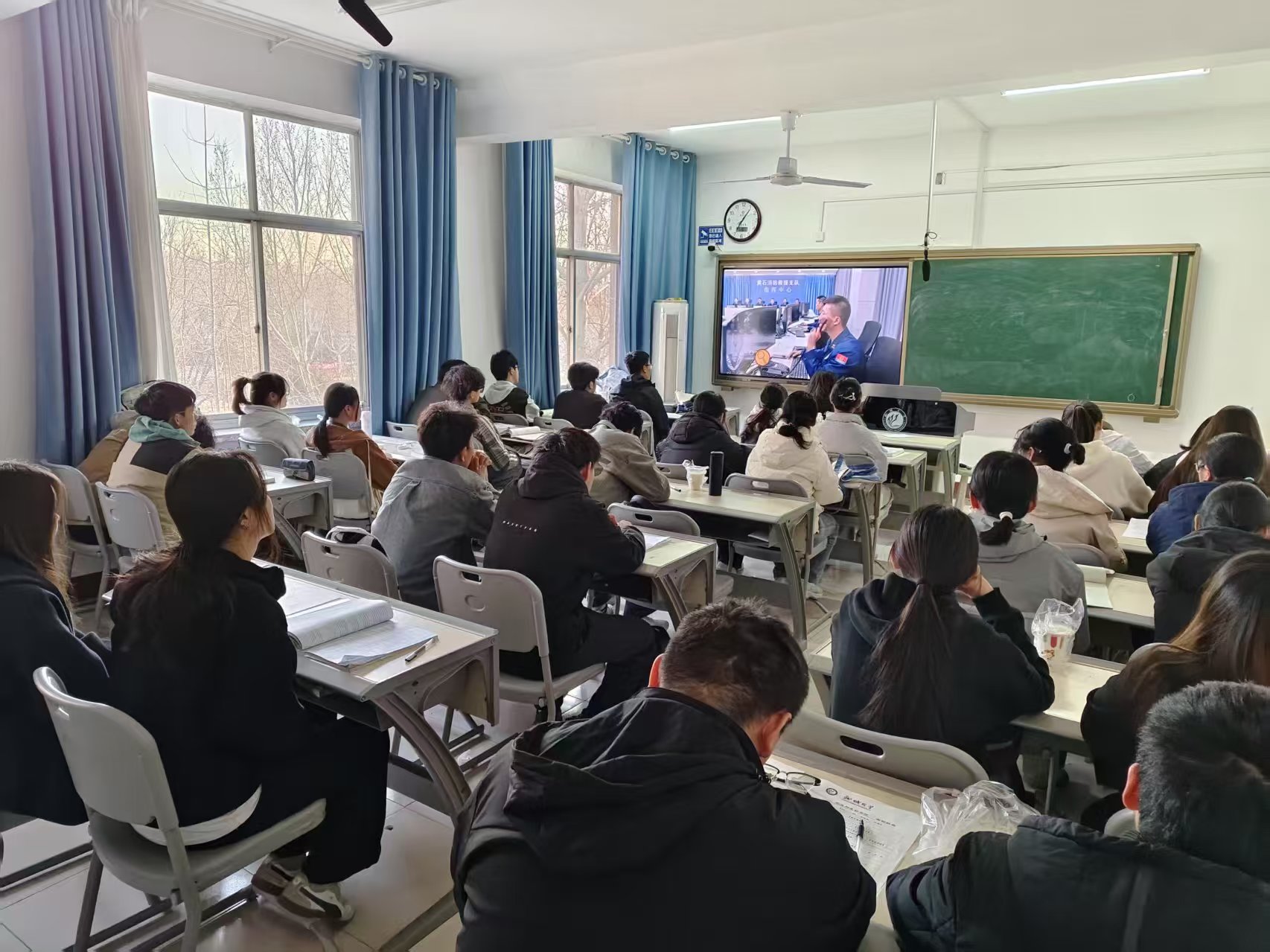 于一号办公楼各教室组织全院学生集中观看2025春季全国高校消防安全公开课。