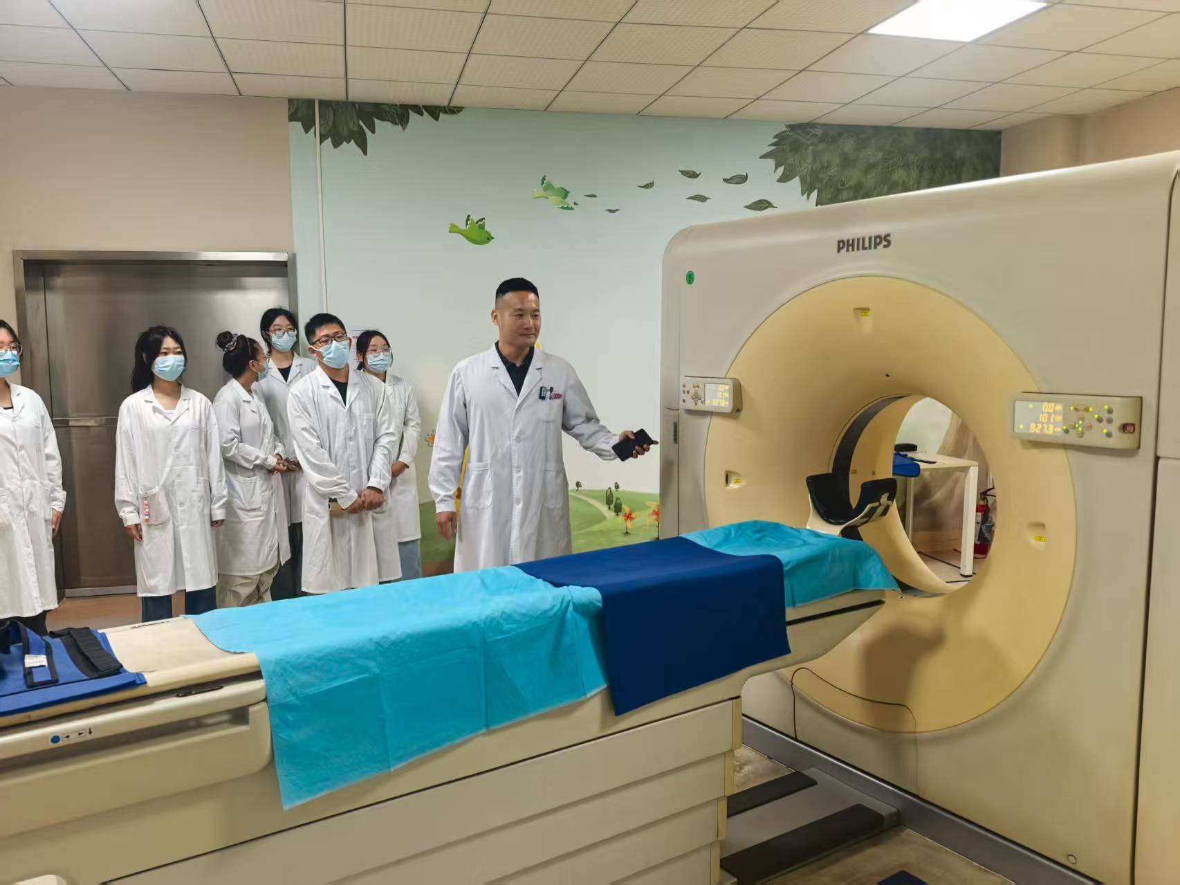 队员们在孙宗博的带领下参观了影像科的工作日常,近距离接触了CT、DR、钼靶、胃肠镜透视等先进医疗设备。孙宗博结合临床实例,详细讲解了各类设备的工作原理、适用范围及操作流程,并重点强调了辐射防护的重要性。同学们一边认真聆听,一边积极提问,现场气氛热烈。通过实地观摩,大家对医学影像技术在疾病筛查、诊断和治疗中的关键作用有了更直观、更深刻的认识。