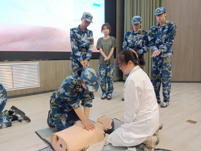 讲座现场,郝海丽以理论讲解与案例分析相结合的方式,系统讲解了传染病防护要点;针对运动损伤、意外摔倒等常见校园意外,谷席娟详细演示了伤者搬运的规范姿势,并手把手指导伤口清洁、消毒与包扎的操作步骤。在急救技能核心环节,王鑫重点讲解了心肺复苏(CPR)的操作流程——从判断意识、呼叫急救,到胸外按压的深度与频率、人工呼吸的正确方法,再到海姆立克急救法针对成人、儿童的不同操作技巧,确保每一个细节都清晰易懂。随后,“医”心向阳志愿服务队的志愿者进行实操演示,他们动作标准、流程熟练,不仅精准还原了医生讲解的要点,还针对新生可能存在的操作误区进行现场提醒,帮助大家更直观地理解急救技能的关键环节。讲座最后,在校医院医生和志愿者的指导下,新生们纷纷上台尝试,从调整按压姿势到控制呼吸节奏,志愿者们耐心在旁纠正,确保每位新生都能亲身体验急救操作,切实掌握基础技能。