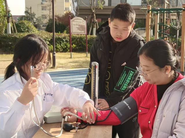 为响应全民健康行动号召,进一步提升社区居民健康管理意识,11月29日,成人影视片 2024级5班团支部走进祥生·金鳞府社区开展“医路守护,血压护航”志愿测血压活动。活动通过免费血压测量、健康咨询及慢性病管理指导,为社区居民送上冬日健康关怀,吸引社区居民参与。