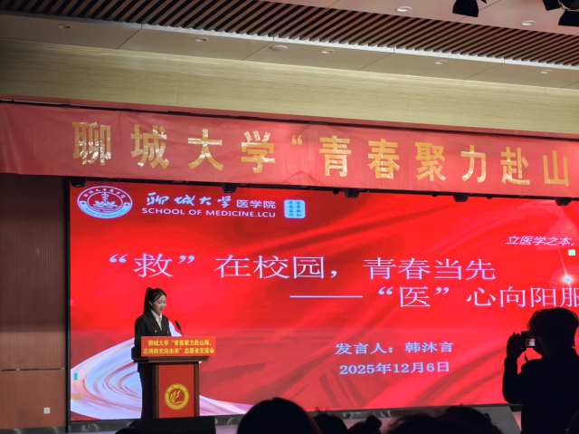 青年志愿者协会理事长陈国旗首先代表协会致辞,为此次会议缓缓拉开了帷幕。医心向阳志愿服务队代表韩沐言以“‘救’在校园,青春当先”为主题展开汇报。她从服务队“守护生命安全、普及急救技能”的初心与组织架构、核心理念、服务宗旨、服务定位谈起,着重分享了服务队开展的特色事迹:包括面向全校新生的急救技能培训、深入社区的健康科普、多项大型校园活动的医疗保障,以及与聊城市红十字会合作开展、覆盖广大教职工的红十字救护员培训项目。谈及服务队取得的扎实成效,韩沐言列举了服务队在师生与社区居民中累计服务超万人次、急救知识知晓率显著提升等社会效益,以及在国家级、省级急救技能大赛中屡获优异成绩,并为学校入选“全国学校急救教育试点学校”贡献一份力量。面向未来,韩沐言则表示医心向阳志愿服务队将继续完善可持续服务模式,拓宽服务范围,丰富服务内容,推动急救知识融入更广领域。