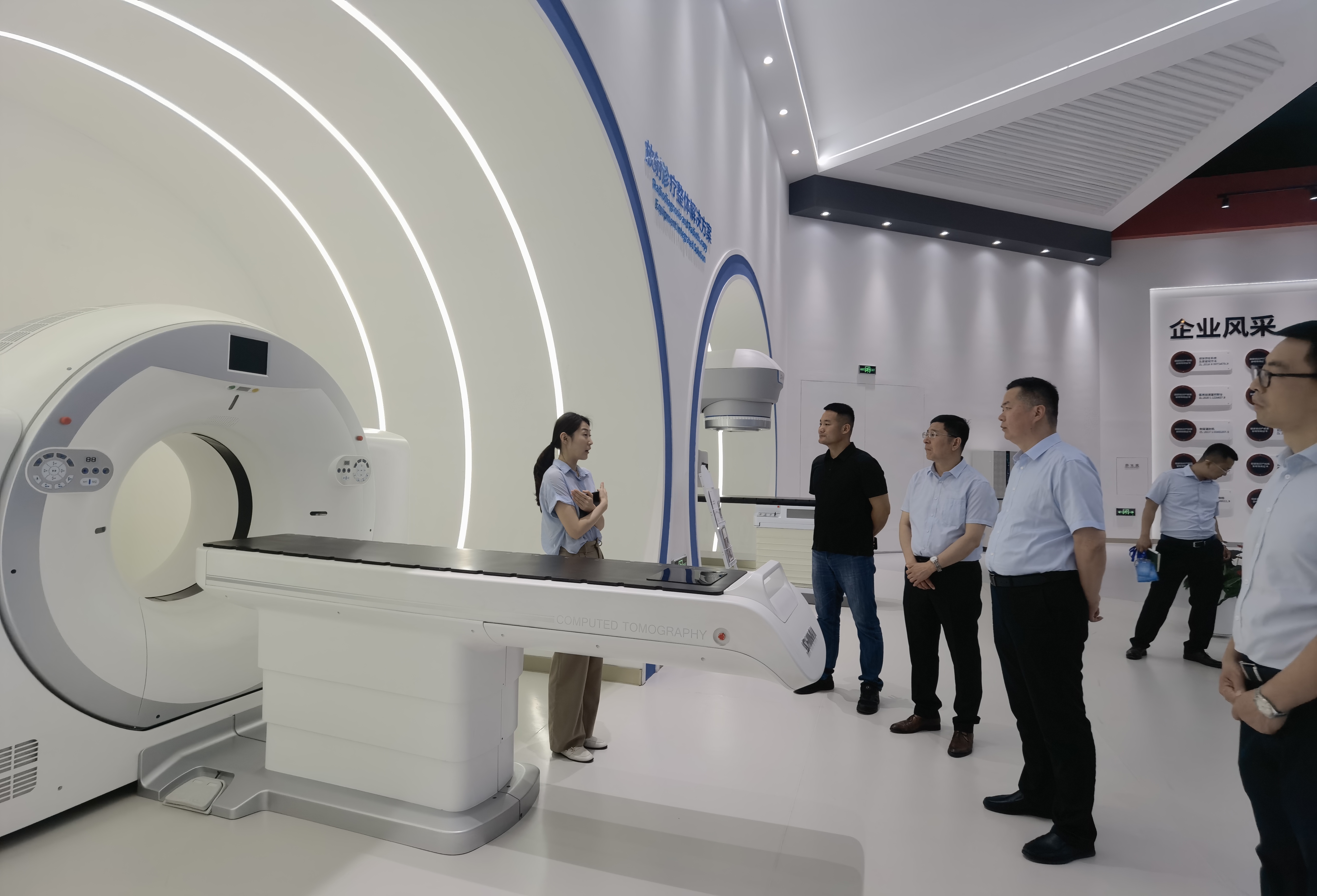 在新华医疗器械股份有限公司,明辉一行重点参观、了解了医学影像虚拟仿真教学实验平台、动态DR、85厘米超大孔径CT、医用电子直线加速器等公司最新产品和创新成果。并与公司相关负责人座谈,了解了公司的主要发展历程,双方围绕智能影像工程专业的人才培养、实验室建设和学生就业等工作进行了深度交流。