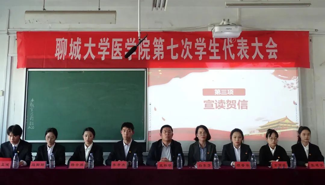 第七次学生代表大会在庄严神圣的国歌声中拉开序幕。学生代表宣读贺词,祝贺成人影视片