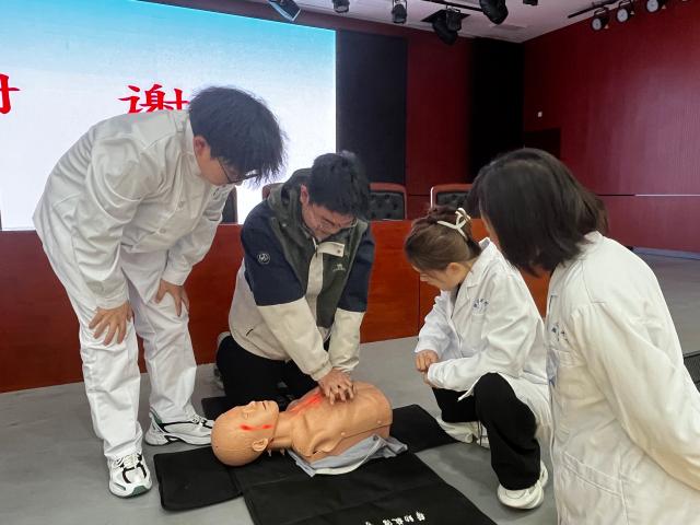 张秀春、王丽静两位老师分别讲解胸外按压、人工呼吸和海姆立克急救法的理论知识,带领同学们走出了急救知识盲区。服务队成员进行实操演练,展示了胸外按压与人工呼吸的要领与手法,帮助同学们学习并掌握应对突发状况的应急处理能力。在席萌萌、孙文辉的指导下,“医”心向阳服务队成员向大家演示海姆立克急救法的具体操作步骤与技术要领,并强调要牢记“石头,剪刀,布”的急救小口诀。同学们认真聆听知识要点、细心观察动作要领,学习氛围浓厚。