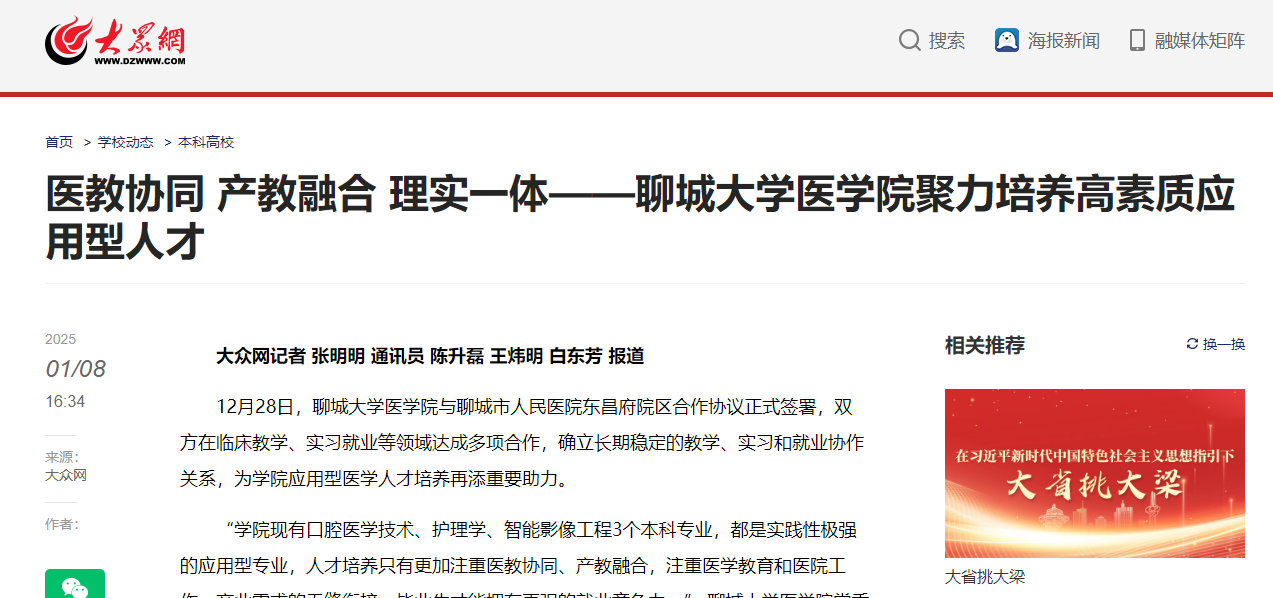 与聊城市人民医院东昌府院区合作协议正式签署,双方在临床教学、实习就业等领域达成多项合作,确立长期稳定的教学、实习和就业协作关系,为学院应用型医学人才培养再添重要助力。