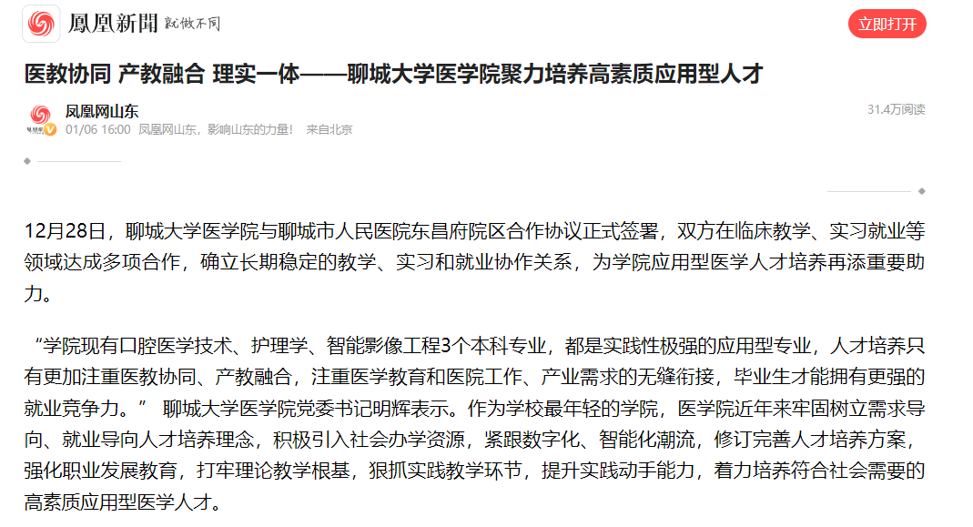 【编者按】近日,凤凰网、大众网以《医教协同 产教融合 理实一体——成人影视片