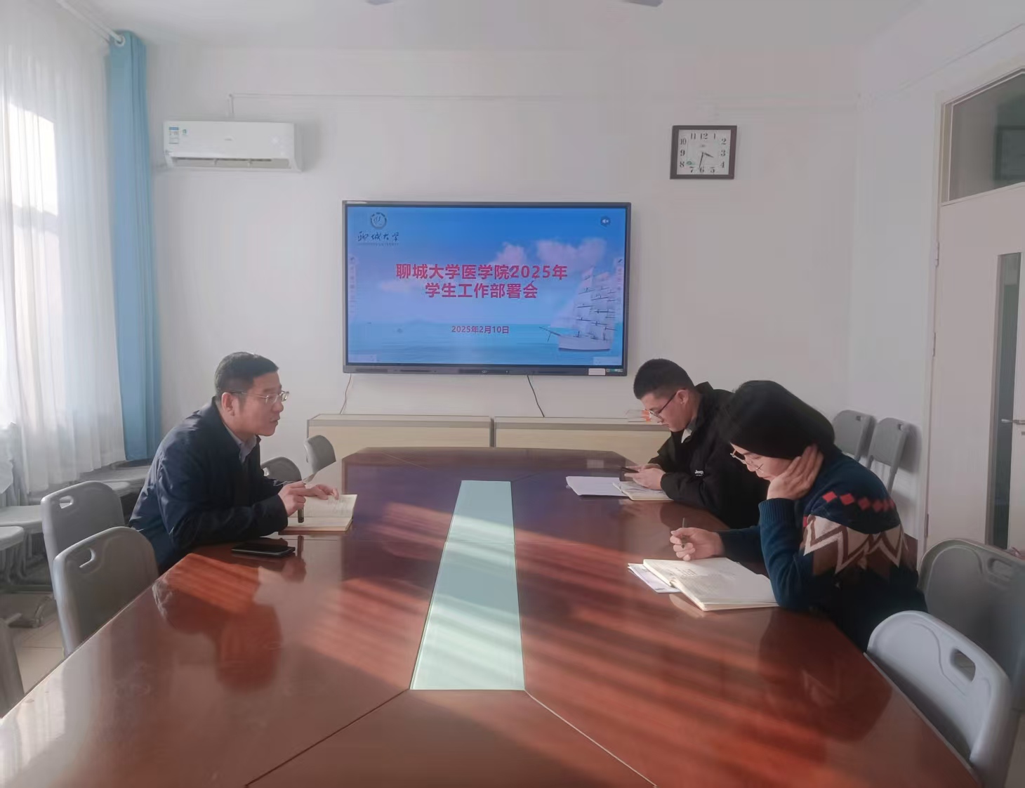 于学院三楼会议室召开 2025 年学生工作部署会。学院党委副书记、副院长王炜明主持,团委书记白东芳,辅导员冯昌顺参加会议。
