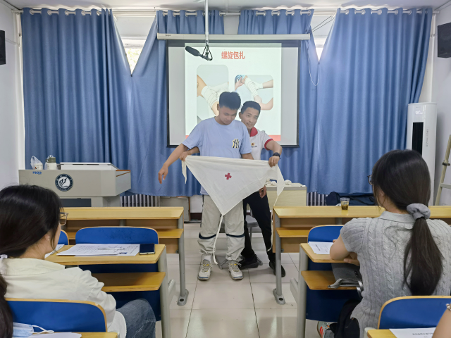 培训现场,许光建以丰富的救援知识储备与鲜活案例,系统展开理论教学。为帮助同学们理解心肺复苏的科学原理,许光建用“水泵模型”作类比对按压要点进行详细讲解:施救者需将手掌根部置于两乳头连线中点,双臂垂直地面,以每分钟100-120次的频率下压至少5~6厘米。在讲解人工呼吸环节,许光建现场示范“仰头抬颌法”开放气道的标准动作,提醒同学们观察患者胸部是否随吹气起伏,避免因气道堵塞导致气体进入胃部。接着许光建结合交通事故、运动损伤等场景,讲解头部、四肢的止血包扎要点:头部出血需用干净布料按压止血,开放性颅脑损伤不可随意移除异物;四肢出血可选择指压、加压包扎或止血带止血,使用止血带时需记录时间,每半小时至一小时放松1-2分钟,防止肢体坏死。此外,他通过案例与模拟教学强调,救援中要以冷静温和的态度安抚伤员情绪,缓解其恐惧焦虑,促进配合救治。