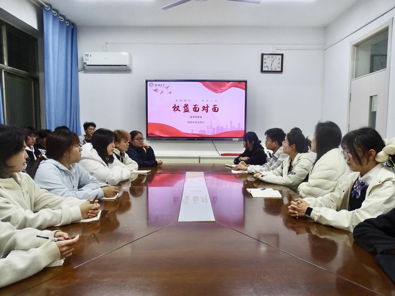 于东一办公楼会议室举办“权益面对面,沟通零距离”主题座谈会.本次座谈会由辅导员史秋波主持,学生会权益服务部及2025级新生代表参加