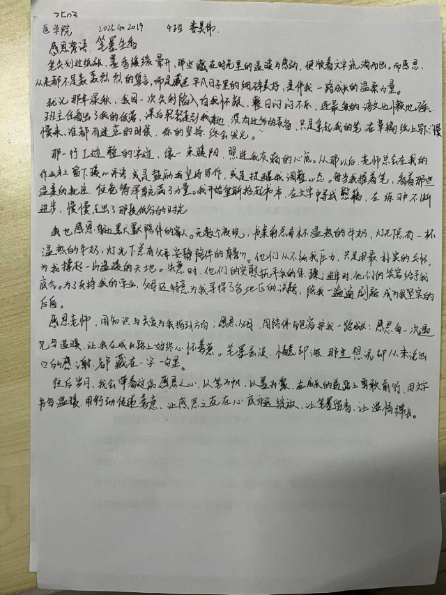 同学们紧紧围绕感恩核心主题,以笔墨为舟、以真情为桨,将心底的感恩之情倾注于字里行间。大家立足求学时光与生活点滴,从多元视角落笔抒怀:同学们行文之中,既有对师长深耕讲台、悉心授业,并于求学途中答疑解惑、引路护航的诚挚感念,也饱含对父母朝夕守候、默默耕耘,以无言付出与长久陪伴温暖岁月的深切温情;他们不仅有着同窗并肩逐梦、朝夕相伴,在日常学习中守望相助、携手共进的美好追忆,更由衷感念国家资助政策的暖心托举与社会各界的善意关怀,为学子潜心治学、逐梦前行筑牢坚实保障。学子们褪去浮华辞藻,用质朴纯粹的文字,书写发生在身边的点滴温暖故事,以细腻柔软的笔触,倾诉藏于心底的真切感悟,一字一句皆饱含真情,一文一篇尽显赤诚。