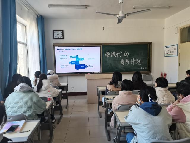 于1#303组织18级、19级同学观看聊城市2022年“春风行动 青鸟计划”云招聘活动。